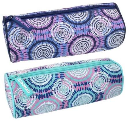 Ceruzatartó 1 cipzárral, kerek forma, 2 különböző mintával; anyaga poliészter, SZxMxMé: 21x8x8cm.