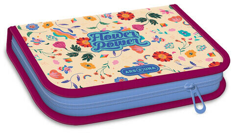 Ars Una töltött tolltartó Flower Power (5260) 23 53572608 Minőségi töltött tolltartó vidám virágos mintával 12 db színes ceruza (háromszögletű) 3 db HB grafit ceruza, 1 vékony és 1 vastag postairón 8 db színes filctoll, 1 db radír, 1 db hegyező, 1 db 17 cm-es egyenes vonalzó, 1 db háromszög vonalzó, órarend A és B hétre. Méret: 128x193x36 mm