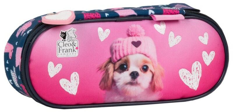 Cleo & Frank tolltartó kislányoknak barátságos kiskutyával és szívecskékkel dekorálva. Az egyrekeszes tolltartó a következőket tartalmazza:- tágas rekesz a szükséges tartozékoknak- 4 rögzítő fül tollak/ceruzák számára és egy hálós zárt zseb- felső részén 5 rögzítő tollak/ceruzák számára- dupla cipzáras csúszka és dekoratív szíves medálMérete: 20,5 x 8