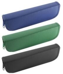 Ökológiai bőr anyagból készült tolltartó Közepes méretű, cipzárral zárható. Gumi hurkokkal az írószerek tárolására. Színek: kék, barna, fekete, zöld.