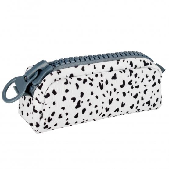 Dalmatás egyterű tolltartó fehér színben, fekete pöttyökkel és nagyméretű cipzárral. Egyterű belsejében sokféle írószer - színes ceruza, radír, hegyező, kis vonalzó - elfér, ami szükséges az iskolai tanórákon, vagy használhatod színes ceruza tartónak rajzórákhoz.