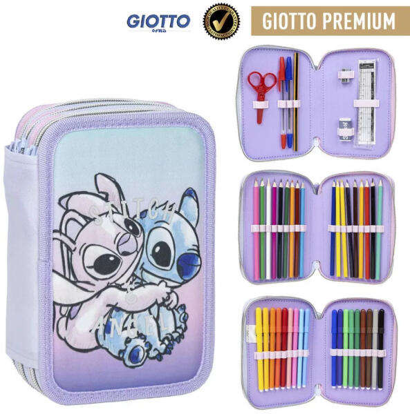Disney Lilo és Stitch, A csillagkutya tolltartó töltött 2 emeletes Tartalma: - 18 db színes ceruza - 18 db színes filctoll - 1 db grafit ceruza - 1 db hegyező - 1 db radír - 2 db toll - 1 db vonalzó - 1 db olló Méret: 12,5x19,5x6,5 cm Kiváló minőségű olasz GIOTTO ceruzákkal és filctollakkal töltött tolltartó!