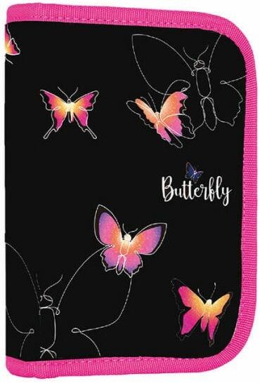 Különleges pillangós mintájú, üres tolltartó 2 kihajtható füllel, melyben kényelmesen elférnek az írószerek. Órarendnek is van hely benne. Lányos tolltartó mérete: 21x4,5x14 cm. Szín: fekete, rózsaszín pillangó motívumokkal. Kialakítása: ké t kihajtható klapnival rendelkezik, melyen kívül órarend és szorzótábla található. Kialakítása: 7+9+9 gumipánt ceruzáknak