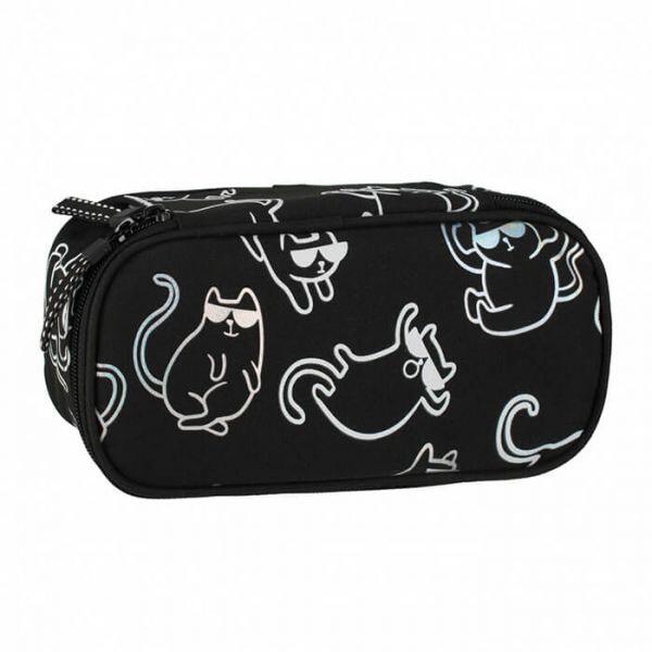 Mókás cicás grafikájú ovális cipzáras tolltartó belső cipzáras zsebbel, középen füllel, melynek mindkét oldalán gumipántok találhatóak. A mélyített belső részbe ömleszthetőek az írószerek. Mérete: 22x6x10 cm. Színe: fekete, fehér macskás grafikájú.