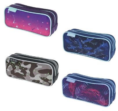 Két rekeszes üres dupla tolltartó 20,5x7x9 cm-es méretben. Anyaga: poliészter, vegyes mintákkal.