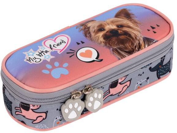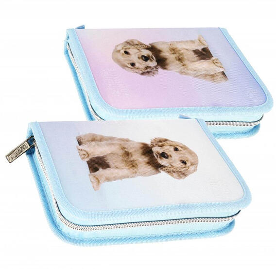 A Kutyás kihajtható tolltartó most teljes felszereltséggel kapható. A két, oldalra kihajtható fül rejti az 1 db grafit ceruzát, az 1 db golyós tollat, a 10 db színes ceruzát, a 12 db filctollat, radírt, hegyezőt és vonalzót. A tolltartóban találsz még órarendet és szorzótáblát is. A tolltartó fedelét és alját aranyos kölyök kutya képe díszíti.
