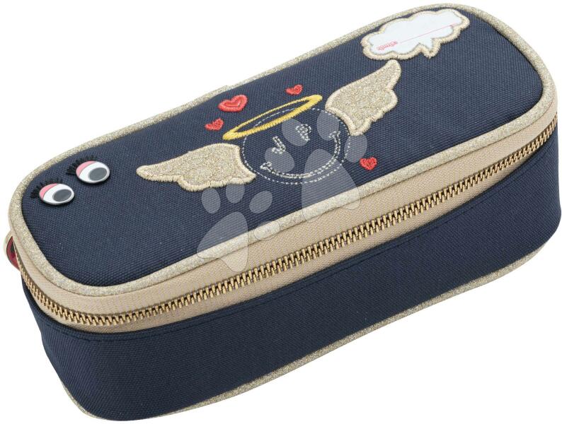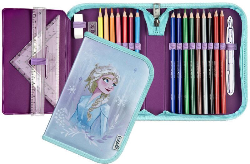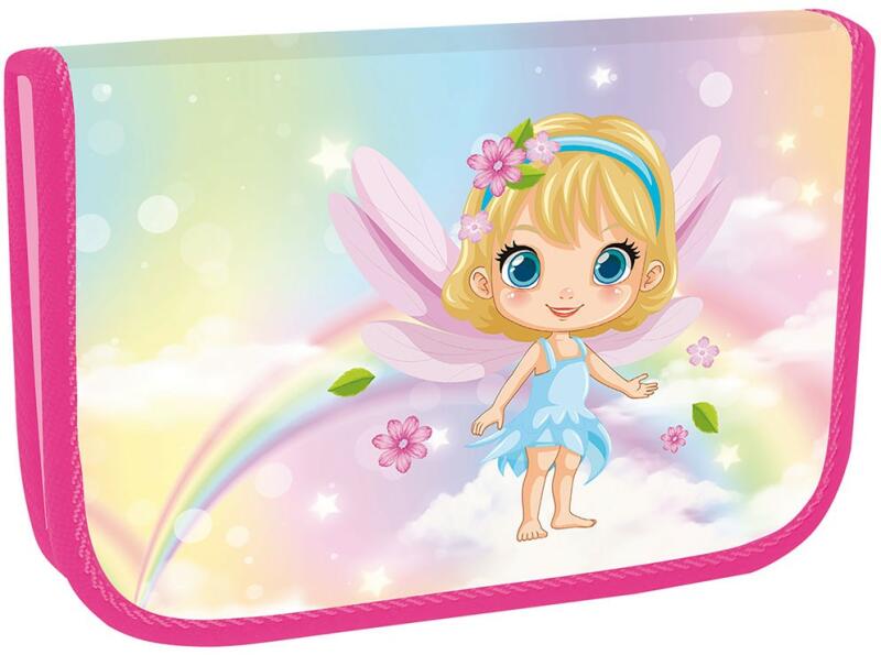 Lányos tolltartó 23 különböző méretű gumiszalaggal a nagyobb ceruzák vagy tollak, vonalzó, hegyező és radír kényelmes tárolásához. A két belső szárny átlátszó zsebbel rendelkezik a külső oladlán, az órarend vagy egyéb apró dokumentumok számára. Belső oldalán egy kis zseb található, amely patenttal zárható. A tolltartók cipzárainak húzókája egy zsinórral v