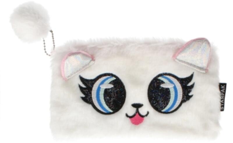 Plüss Cica cipzáros tolltartó pomponnal - Big Eyes nagy szemű, fehér cicát ábrázol, elférnek benne a szükséges írószereid.