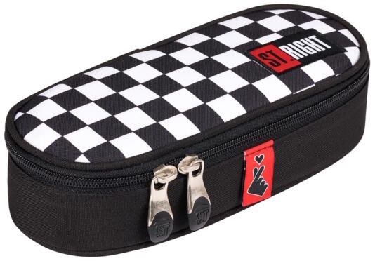 St. Right - K-pop Chain ovális tolltartó fekete fehér pepita kockásan díszítve. Egyterű belsejében praktikus cipzáras zseb is található, így elfér benne az összes írószer, amire az iskolásoknak szüksége van.