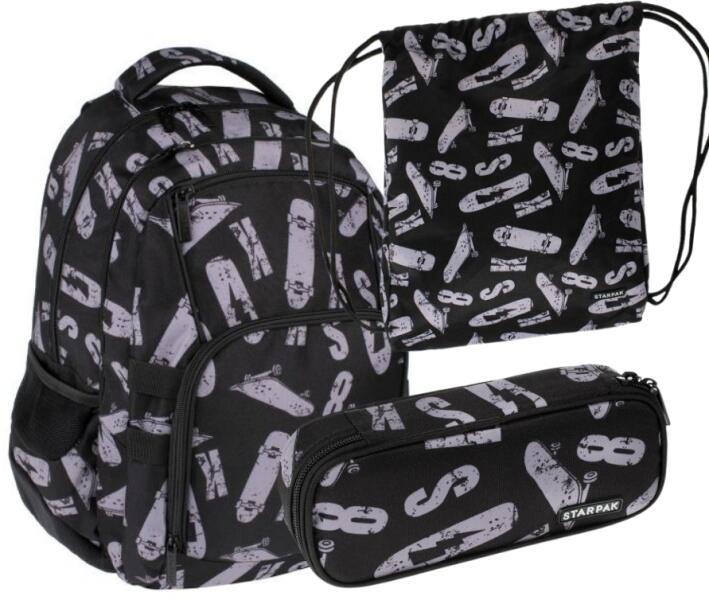 Starpak ergonomikus iskolatáska, hátizsák – Skate Ha valami menő, akkor ez az! Vagány iskolai hátizsák "deszkás" fiúknak és lányoknak, szürke-fekete mintával. A hátizsák anatómiai kialakítású, így kíméli a gerincet, párnázott vállpántjai kényelmes hordást biztosítanak. A 4 rekeszben áttekinthetően minden szükséges iskolaszer elfér, és még egyéb apróságoknak
