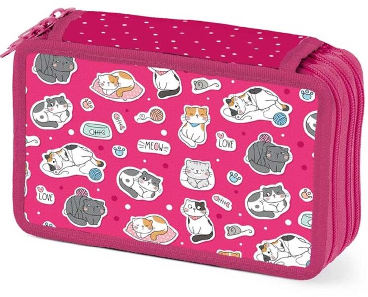 Három emeletes tolltartómacska képpel, üres. 24 hurkot tartalmaz az írószerekhez és 3 nagyobb hurkot, például vonalzóhoz, hegyezőhöz, radírhoz vagy olló. A nagy cipzárnak köszönhetően nagyon könnyen záródik, kiváló minőségű és tartós anyagokból készült. Gyártó: MFP
