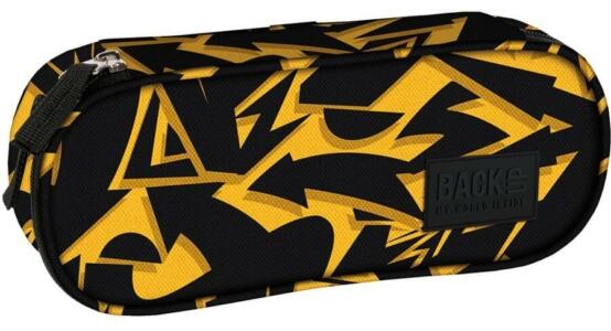 BackUp Geometrikus ovális tolltartó - Sárga nyilak fekete és sárga színösszeállításban, apró nyilakkal és különböző formákkal díszítve. Egyterű belsejében praktikus felhajtható fül is található, melynek egyik oldalán kis cipzáras zseb van, másikon gumifülek tollnak, ceruzának. Az összes írószer elfér benne, amire az iskolában szükséged lehet.