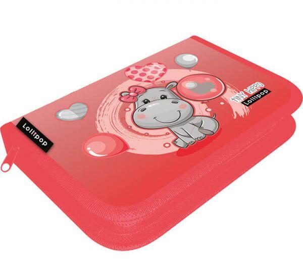 Cuki vízilovas grafikájú két klapnis, kihajthatós tolltartó lányoknak. Belső kialakítás: tolltartó egy-egy oldalán 10-10 ceruza helyezhető el, a kihajtható részen órarendtartó található, a másik falán ceruza- és radírtartó (összesen 27+3 gumispánt). Az órarendtartó zsebben a tolltartóhoz illő 2 db órarend is található. Erős cipzárral. Mérete: 19,5x4x13 cm. Szín