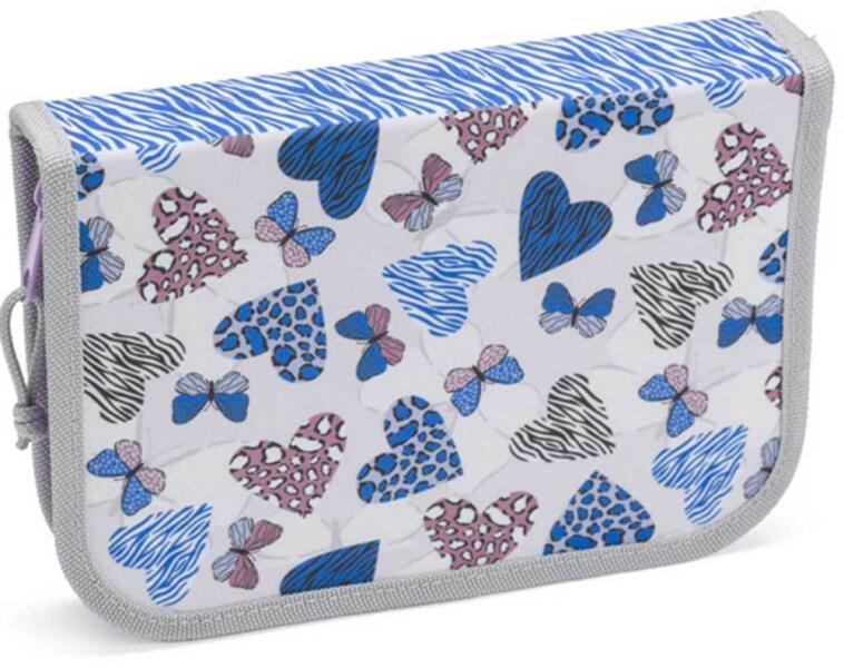 Egyrészes tolltartó lányoknak 23 különböző méretű gumiszalaggal a nagyobb ceruzák vagy tollak, vonalzó, hegyező és radír kényelmes tárolásához. A két belső szárny átlátszó zsebbel rendelkezik a külső oladlán, az órarend vagy egyéb apró dokumentumok számára. Belső oldalán egy kis zseb található, amely patenttal zárható. Újdonság : az egyrészes tolltartók ci