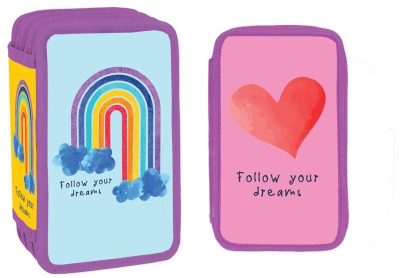 Egyemeletes tolltartó két kihajtható füllel. A gumis tárhelyeknek köszönhetően összesen huszonegy toll, ceruza és filctoll fér el benne. A három szélesebb fogantyúban vonalzó, körző vagy olló is elfér. Két nagyobb tárhely a radír és a ceruzahegyező számára. A tolltartó bélelt, így megbízhatóan védi az összes íróeszközt. Minőségi cipzárral záródik, nagy, erg