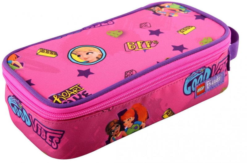 LEGO Friends Good Vibes - puzdro hranaté Puzdro na ceruzky do školy, škôlky či na domácej kreslenie. Puzdro má dostatok priestoru pre mnoho ceruziek, pasteliek či per. Puzdro má všitú menovku pre jednoduchú identifikáciu a na boku pútko, vďaka ktorému sa ľahko prenáša. Je vyrobené z odolného materiálu bez použitia PVC. Vyberajte zo širokej ponuky designov s obľúbenými LE