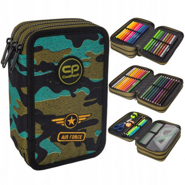 A Coolpack - Jumper felszerelt 3 emeletes tolltartó - Air Force teljes felszereltséggel kapható. A kiváló minőségű tolltartó három rekesze lehetővé teszi, hogy a tanuló szépen és kényelmesen rendszerezze a kellékeit. A tolltartó tartalma: 2 db golyóstoll, 2 db grafit ceruza, radír, hegyező, olló, 3 db vonalzó, 18 db színes ceruza, 18 db filctoll. A Coolpack - Jumper tolltar