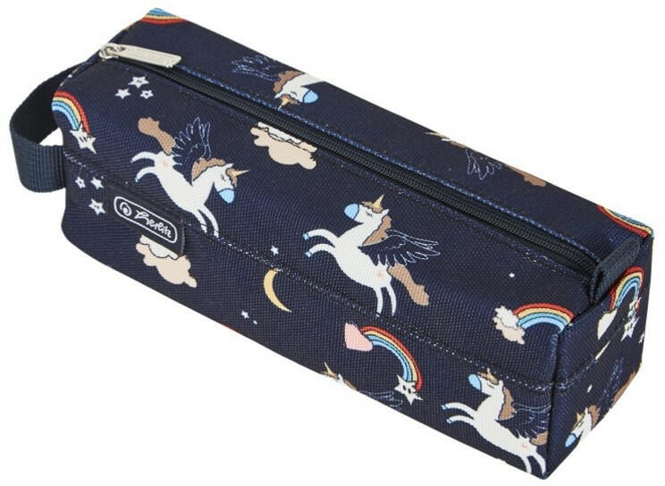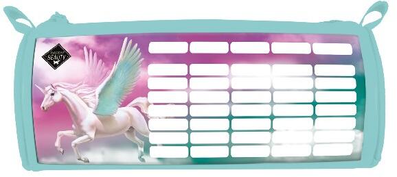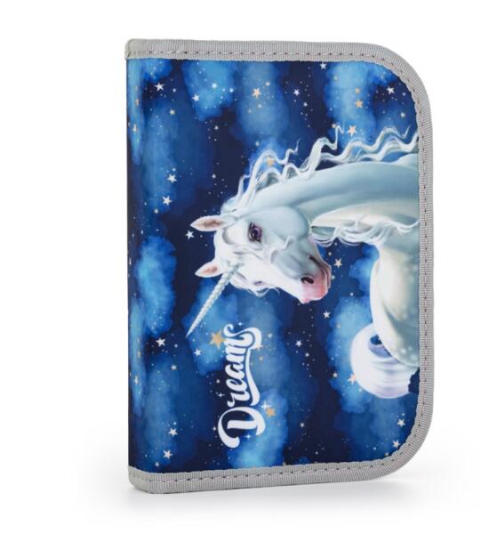 A dekoratív tolltartó sötétkék alapszínén egy felhők között repülő, varázslatos, fehér unikornis meseszép figurája látható, ami a kislányokra annyira jellemző álmodozást és a szépségre, jóságra való törekvést szimbolizálja. A tolltartót varázslatos fehér unikornis dekorálja a felhők között sötétkék háttéren. A kihajtható tolltartóban gumipántok segíts