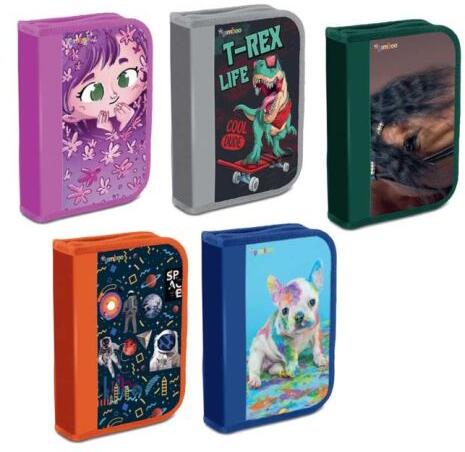 Egyszárnyú tolltartó tartozékokkal, 10 motívum keverékével.