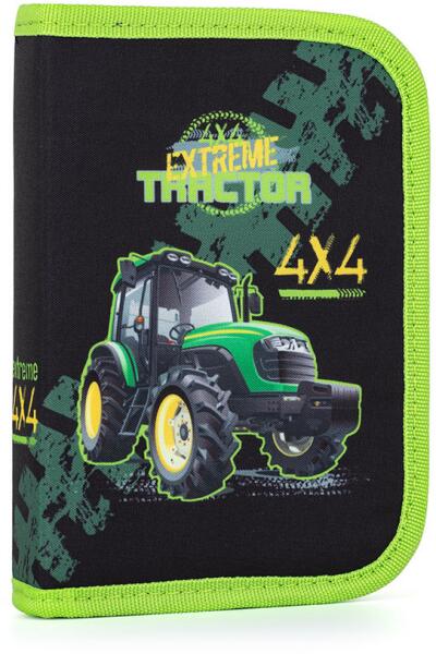 Egyszintes iskolai tolltartó, üres. 25 gumiszalagot tartalmaz az írószerek tartásához. A belső szárnyakon átlátszó fóliák vannak az órarendhez.
