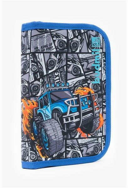 Budmil kihajtható tolltartó - Monster Truck Budmil tolltartó Fekete-fehér képregényszerű minta és nagykerekű szuperautók díszítik a vagány fiús tolltartót, melyet első osztályos kortól ajánlunk. Az egyszintes tolltartó kihajtható fülekkel rendelkezik, így praktikusan rendezhetőek az írószerek. Az egyik fülön átlátszó zseb van órarenddel, a másikon hálós cipzáros
