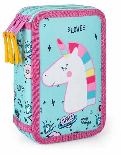 OXYBAG unikornisos 3 emeletes tolltartó - Unicorn Power Vidám és divatos unikornisos minta díszíti az emeletes tolltartó anyagát. Szivárvány színek, trendi feliratok jellemzik. A 3 szintes tolltartó cipzárral záródik. A belső rész nem mintázott, a ceruzák pedig gumipántok segítségével rendszerezhetőek. Az emeletes tolltartó belsejében 40 db írószer elhelyezésére van le