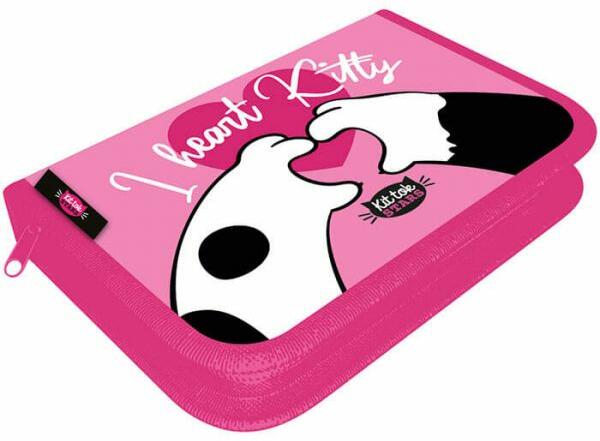 Aranyos cicás grafikájú két klapnis, kihajthatós tolltartó lányoknak. Belső kialakítás: tolltartó egy-egy oldalán 10-10 ceruza helyezhető el, a kihajtható részen órarendtartó található, a másik falán ceruza- és radírtartó (összesen 27+3 gumispánt). Az órarendtartó zsebben a tolltartóhoz illő 2 db órarend is található. Erős cipzárral. Mérete: 19,5x4x13 cm. Minős