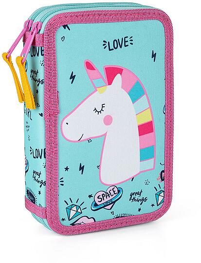OXYBAG unikornisos emeletes tolltartó - Unicorn Power Vidám és divatos unikornisos minta díszíti az emeletes tolltartó anyagát. Szivárvány színek, trendi feliratok jellemzik. A két szintes tolltartó cipzárral záródik. A belső rész nem mintázott, a ceruzák pedig gumipántok segítségével rendszerezhetőek. Az emeletes tolltartó belsejében 25 db írószer elhelyezésére van l