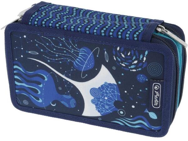Dupla tolltartó, 2 tárolórekesszel + 1 cippzáras rekesszel, melyben tolltartó gumipántok és hálós zseb található. Mérete: 23,5x11x7,5 cm, anyaga: poliészter.