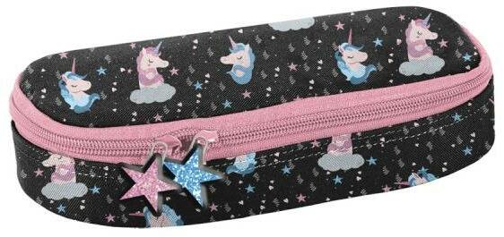 Unikornisos ovális tolltartó STARS - Paso A minőségi ovális tolltartó fekete, világoskék és rózsaszín színeivel elsősorban a lányoknak lesz remek kiegészítő az iskolai felszereléshez. Mintázatán unikornisok és apró csillagok tűnnek fel. A tolltartó cipzárral záródik. Belseje egy rekeszes, ahová a különböző formájú egyéb eszközök rögzítés nélkül tehetőek.