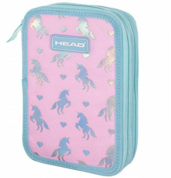 HEAD unikornisos emeletes tolltartó - Heart A kellemes pasztelt színű, kék és rózsaszín tolltartó az unikornisok és a holografikus minták kedvelőinek készült. Anyagán apró szívecskék is láthatók. Színe és mintázata alapján elsősorban lányoknak ajánlott. A két szintes tolltartó cipzárral záródik. A belső rész nem mintázott, a ceruzák pedig gumipántok segítségé