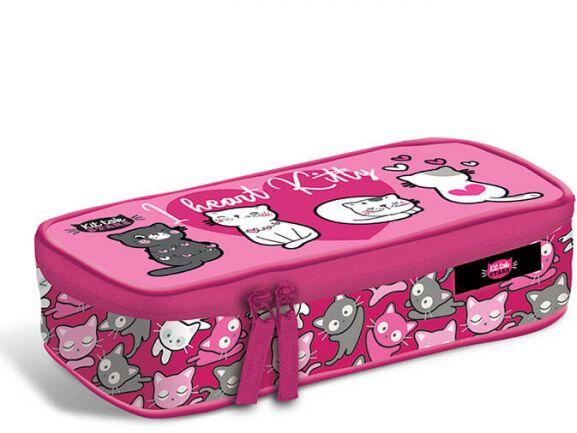 Aranyos cicás grafikájú bedobálós tolltartó nagyoknak, felsősöknek, mely középen kétoldalas gumipántos elválasztóval rendelkezik, így a rajta lévő 10 gumipánt alá rendszerezhetőek az írószerek. Az ovális formájú tolltartó dupla cipzáras. Belül egyterű, középen egy kétoldalas gumipántos elválasztó található a ceruzák és írószerek rögzítésére, valamint eg