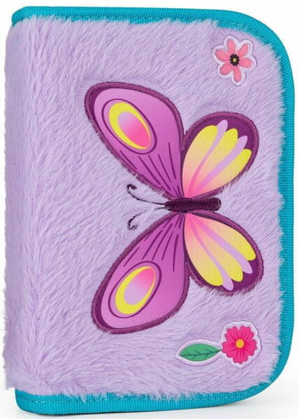 Plüss borítású egyszintes iskolai tolltartó 2 rekesszel, töltetlen. 25 gumihurkot tartalmaz az íróeszközök és a tanításhoz szükséges apró tárgyak rögzítésére. Gyerekek számára 3 éves kortól alkalmas.