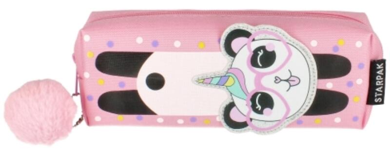 Unikornis panda szögletes tolltartó vidám pandakornis mintával, pomponnal a szükséges írószerek tálrolására.