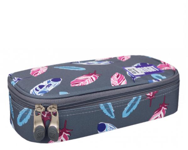 St. Right Indian Feathers szögletes XL tolltartó A fekete háttér előtt pasztell színű tollak hullanak alá ezen a nagy méretű tolltartón, amely elsősorban lányoknak ajánlott. Az írószertartó nem csak divatos, hanem praktikus is. Minden írószer rendszerezhetően belefér, amire az iskolában szükség lehet. A szögletes tolltartó dupla cipzárral záródik. Belseje szürke szín