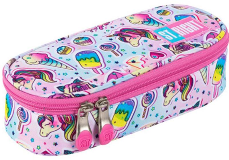 St. Right ovális tolltartó - Sweet & pink A pink színvilágú tolltartón csajos ikonok, mint unikornis, szivárvány, szívecske szerepelnek. Az elsősorban lányoknak tervezett tolltartó praktikus választás, nagyobbaknak kifejezetten előnyös rendszerezésű. Az ovális tolltartó dupla cipzárral záródik. Belseje szürke. Rendelkezik egy belső füllel, amelynek egyik oldalán cipz