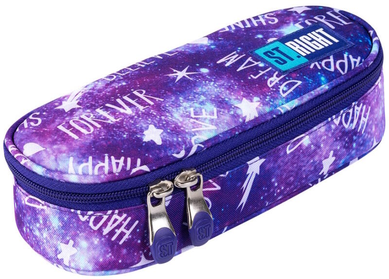 St. Right ovális tolltartó - Galaxy Girl Egy rekeszes tolltartó lányoknak A látványos, élénk színű tolltartó anyagát lilás színű ködfoltok mintázzák, melyet trendi feliratok egészítenek ki. Az elsősorban lányoknak tervezett tolltartó praktikus, a nagyobb gyerekek részére könnyedén kezelhető, előnyös kialakítású. Az ovális tolltartó dupla cipzárral záródik. Bel