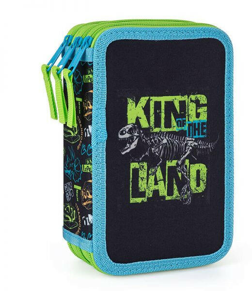 King Land feliratú, dinoszaurusz mintás 3 emeletes tolltartó fiúknak. Kialakítása: egyik szinten 8+8 gumipánt, középső szinten 8+8 gumipánt, 6 gumipánt ceruzának, 3 szélesebb radírnak, hegyezőnek és vonalzónak, valamint a szélén átlátszó órarendtartó található. Mérete: 20x7x13,5 cm.