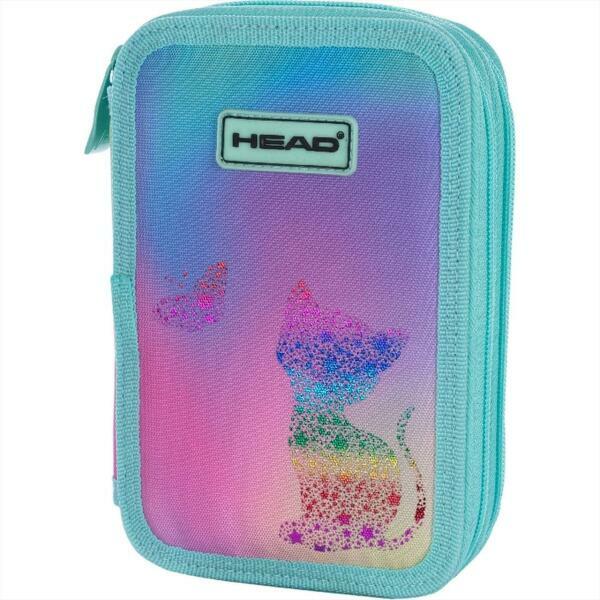 HEAD cicás emeletes tolltartó - Kitty Ombre A szivárvány színeiben pompázó tolltartó csillagokkal és holografikus cica mintával díszített. A trendi tolltartó ideális kiegészítője lehet lányok iskolafelszerelésének. A két szintes tolltartó cipzárral záródik. A belső rész nem mintázott, a ceruzák pedig gumipántok segítségével rendszerezhetőek. Az emeletes tolltartó