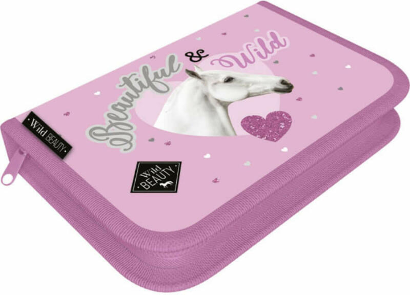 Szép fehér lovas mintájú, két klapnis, kihajthatós tolltartó lányoknak. A tolltartó mérete: 19,5x4x13 cm. Belső kialakítás: tolltartó egy-egy oldalán 10-10 ceruza helyezhető el, a kihajtható részen órarendtartó található, a másik falán ceruza- és radírtartó (összesen 27+3 gumispánt). Az órarendtartó zsebben a tolltartóhoz illő 2 db órarend is található. Mérete: