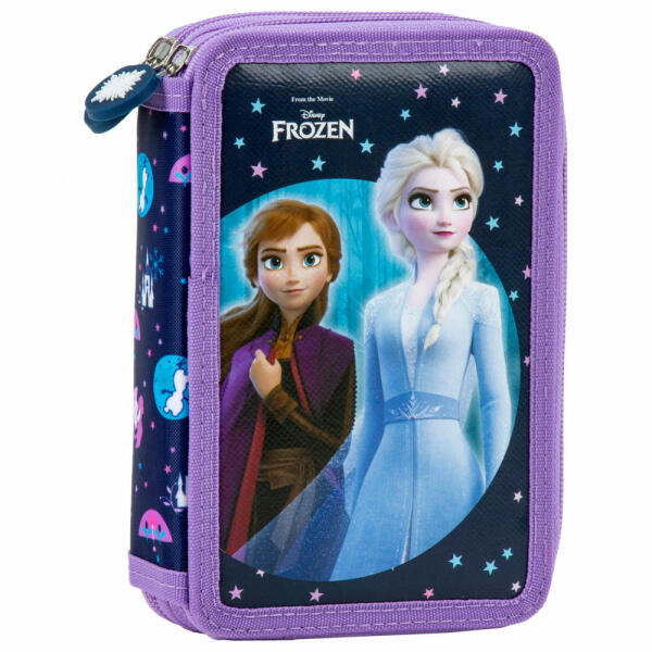 Jégvarázs 2 emeletes tolltartó felszerelt - Magic A Jégvarázs 2 emeletes tolltartó sötétkék színvilágú. A népszerű Disney Jégvarázs mese hercegnői, Elsa és Anna látható, ahogy új kalandjukra indulnak. Mintája és színei miatt lányoknak ajánlott. A tolltartó praktikus kialakítású, könnyen átlátható és rendszerezhető, emiatt első osztályos kortól is ideális vá