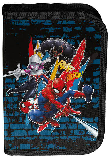 A Marvel kihajtható tolltartó - Spiderman (SP24GG-P001BW) tolltartón menő, pókemberes minta látható. A tolltartó belsejében két kihajtható fül található, ezeken lehet a sok-sok ceruzát, filctollat, radírt a gumis fülecskék segítségével elrendezni. Minden szükséges iskolai eszköznek megtalálod benne a helyét. Hozzá illő iskolatáskával és tornazsákkal összeállíthat