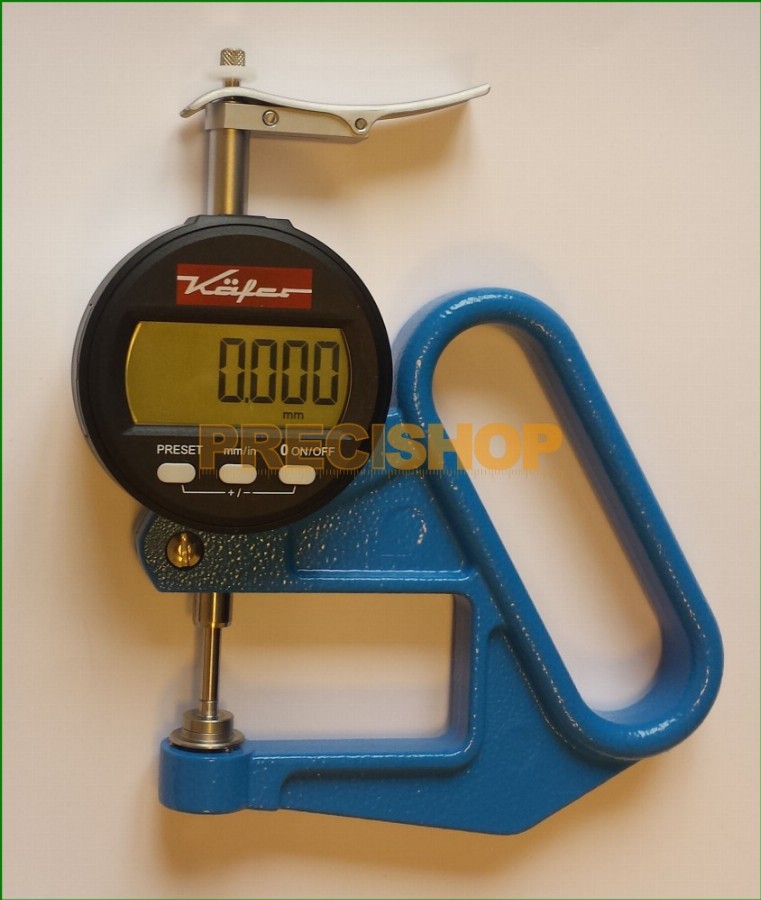 Fóliák, lemezek, papír, gyors-vastagságmérésére, tapintó alul/felül d=10mm, 10/0,001mm digitális órával, kengyel benyúlása 50mm, adatkimenttel. Digitális mérőóra funkciói: Nullázás (ZERO), mm/inch átváltás, Adattartás (HOLD), Ref I / Ref II, Mérési irány váltása, adatátvitel. Azonos áron rendelhető az adatlapon látható a, b, d vagy e jelű tapintóval is. Rendel