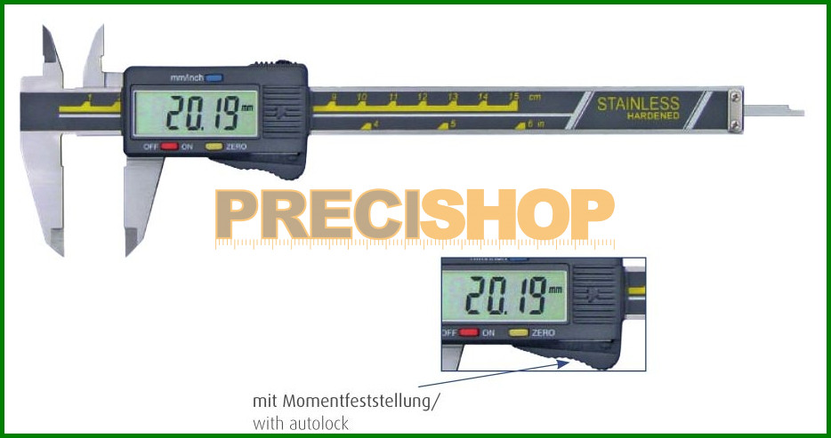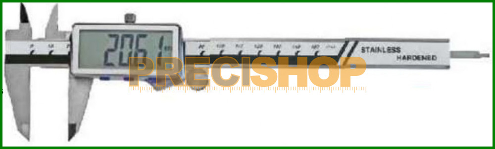 • edzett rozsdamentes acél • 4-szeres mérés • nagy kijelző, 17 mm-es szám • méréstartomány 150 mm • pontosság 0,03 mm • leolvasás 0,01 mm vagy 0,0005” • mm/Inch, nullázás, Ki/Be kapcsolás • tokban