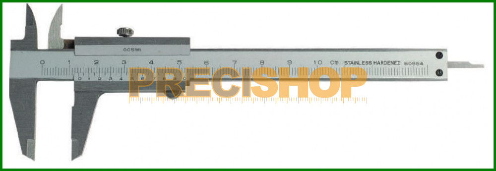 200 mm, rozsdamentes, matt-krómozott, fadobozban mérési tartomány 200 mm, mérőpofa hossza 60 mm, rozsdamentes acél, edzett, nóniusz 1/20 + 1/128” keskenyített pofák belső méréshez (2 x 5 mm = 10 mm)