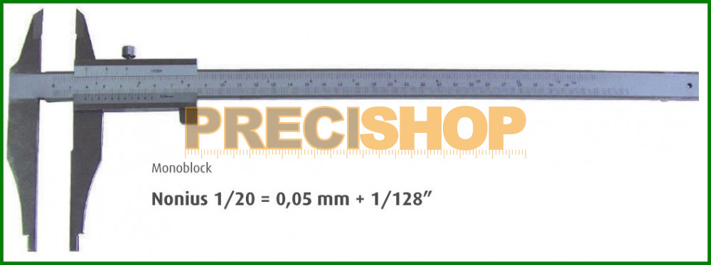 • rozsdamentes acélból • mattkrómozott skála • mérőcsúccsal • a csúszka egy darabból • MONOBLOCK • nóniusz 0,05 + 1/128 • pontosság DIN 862 szerint • szállítási dobozban