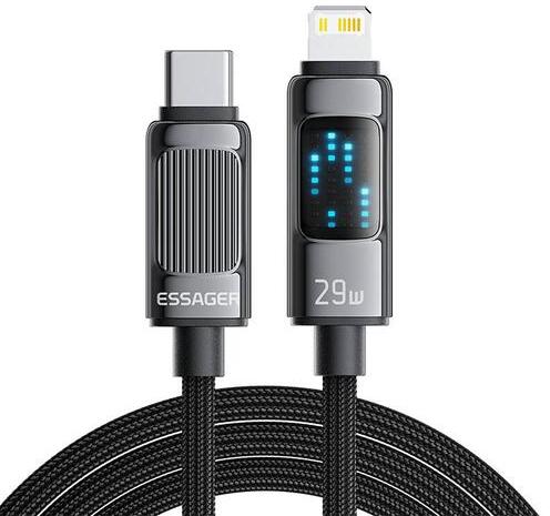 Essager EXCTL-LG0A-P USB-C to lightning 29W 1m USB cable. Looking for a durable cable to charge your iPhone? The Essager cable is the answer to your needs! It offers up to 29W of power, and with Power Delivery support, charging won't take too long. It features a small display that will not only keep you in control of the charging process, but also make it easy to locate the cable in the dark! The