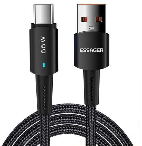 USB-A to USB-C cable, Essager, EXCT-CG01, 66W, 1m (black) The Essager USB-A to USB-C cable provides ultra-fast charging with 66 watts of power and data transfer at 480 Mbps. The accessory features a durable design and offers a practical LED indicator. High output power With an output power of up to 66 watts, the cable allows you to charge even the most demanding devices quickly and efficiently. Wh