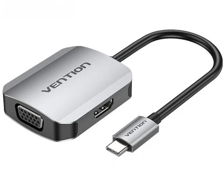 Szürke színű, 15cm hosszú USB 2.0 Type C - VGA/D-Sub + HDMI Átalakító adapter.