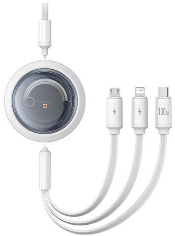 3-in-1 Baseus Free2Draw USB to M+L+C 100W cable, 1.1m (white). Meet Baseus Free2Draw - an innovative cable with which you can conveniently charge 3 different devices at the same time. The collapsible design with three types of connectors - USB-C, Lightning and Micro USB is a guarantee of versatility, while the robust construction and 100W power ensure reliability in any situation. Discover a new l
